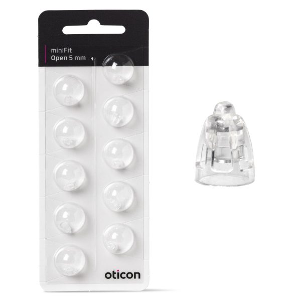 Oticon miniFit Open 5-mm-Kuppeln bestehen aus weichem, hautfreundlichem Material, das sich Ihren Ohren anpasst. Es gibt 3 verschiedene Versionen von miniFit Domes, zwischen denen Sie einfach wechseln können. Hier wird die offene Version gezeigt, die den Gehörgang möglichst wenig abschließt, dafür aber auch weniger Dynamik im verstärkten Klang liefert.